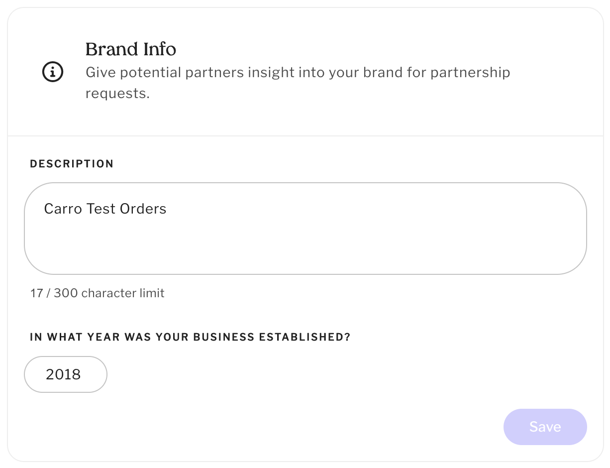 You can provide a description or more details about your brand so potential partners better understand who you are. Merchants who include brand information tend to receive higher approval rates.