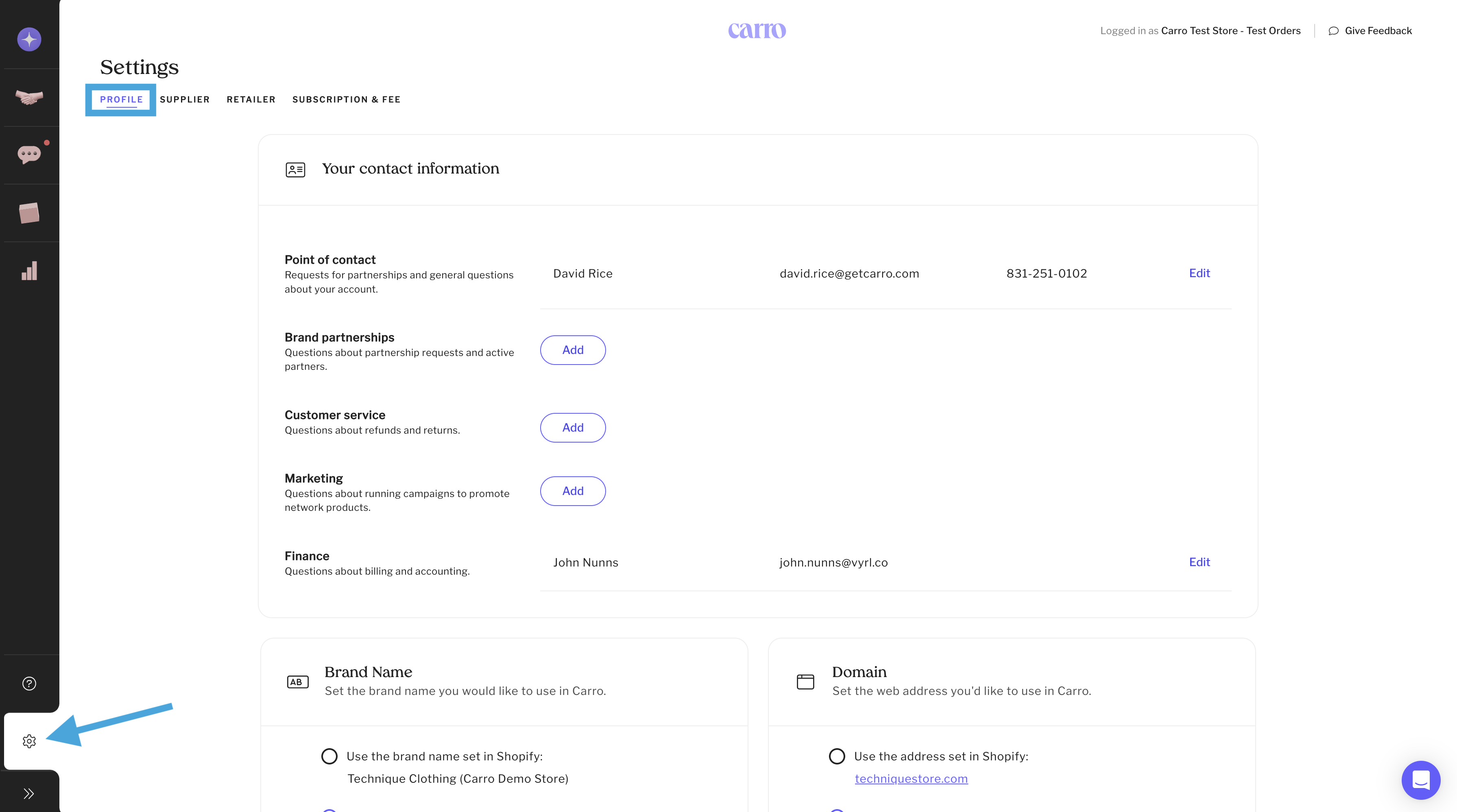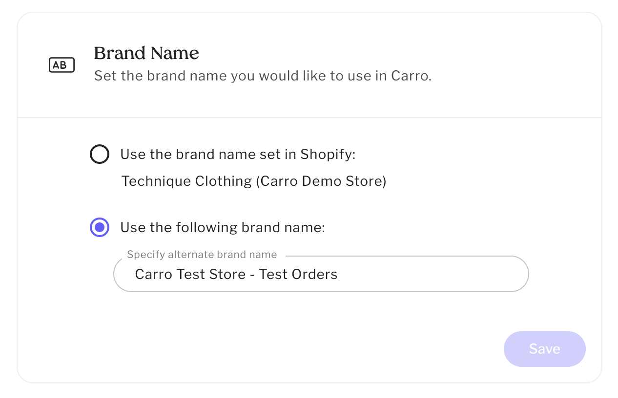 By default, your brand name in the Carro network matches what’s listed in Shopify. You may also set a custom name in Carro if you prefer.
