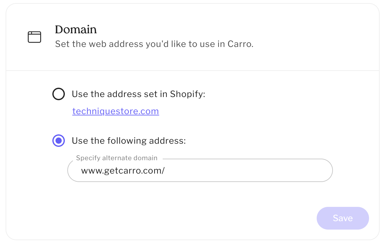 Your website domain is linked to your Carro profile. It’s used so retailers and suppliers can find your store. By default, it’s the same domain as in Shopify, but you’re free to set a custom domain in Carro.