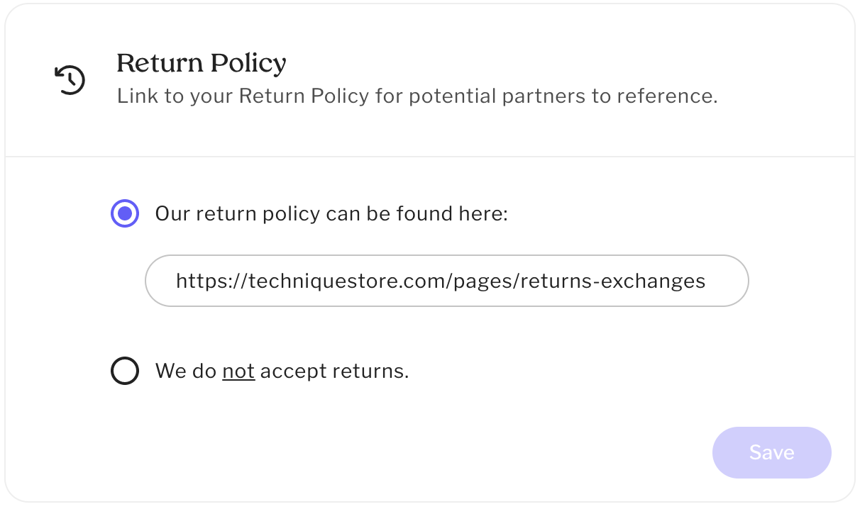Include a link to your store’s Return Policy for existing and potential retail partners to reference or share with their customers.