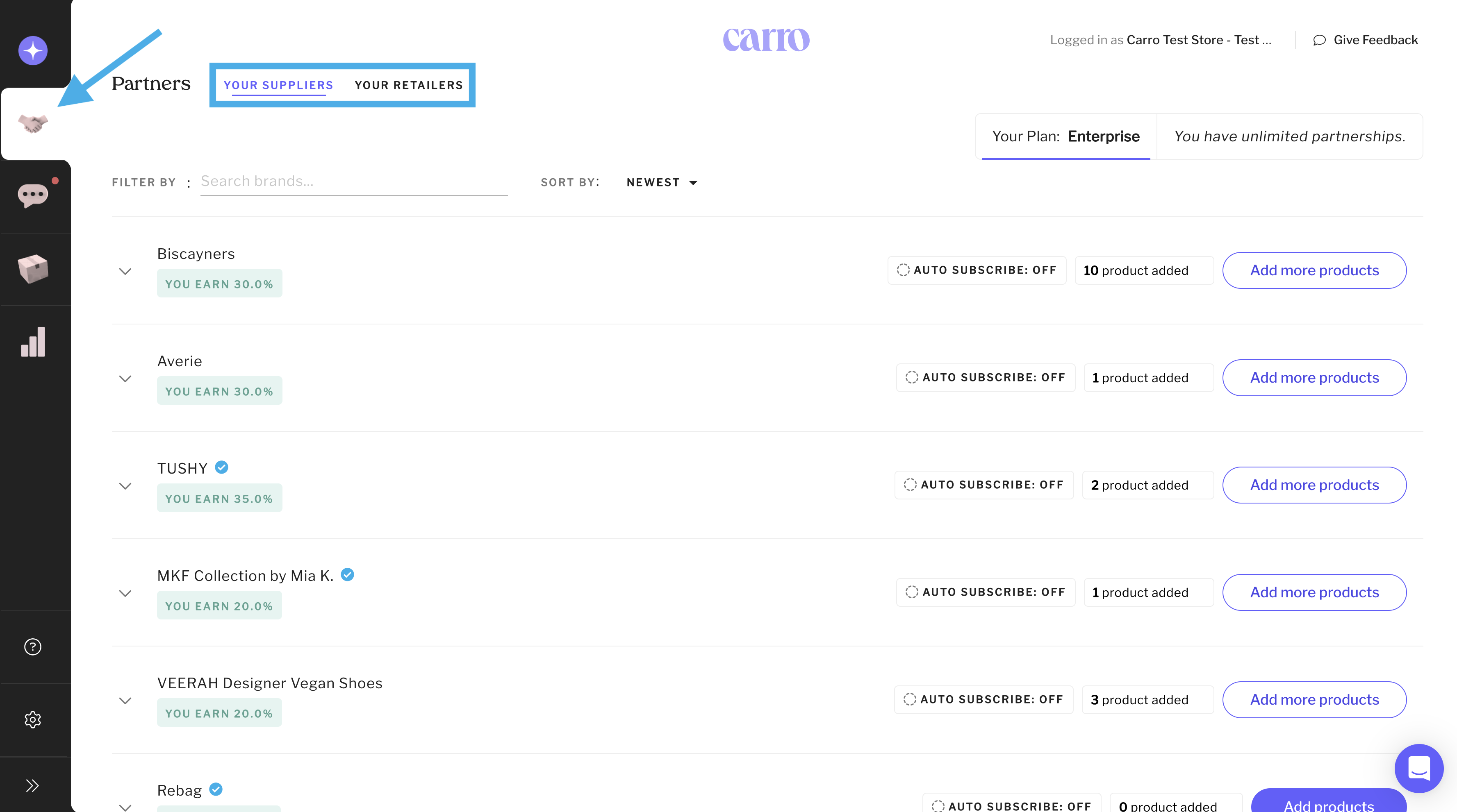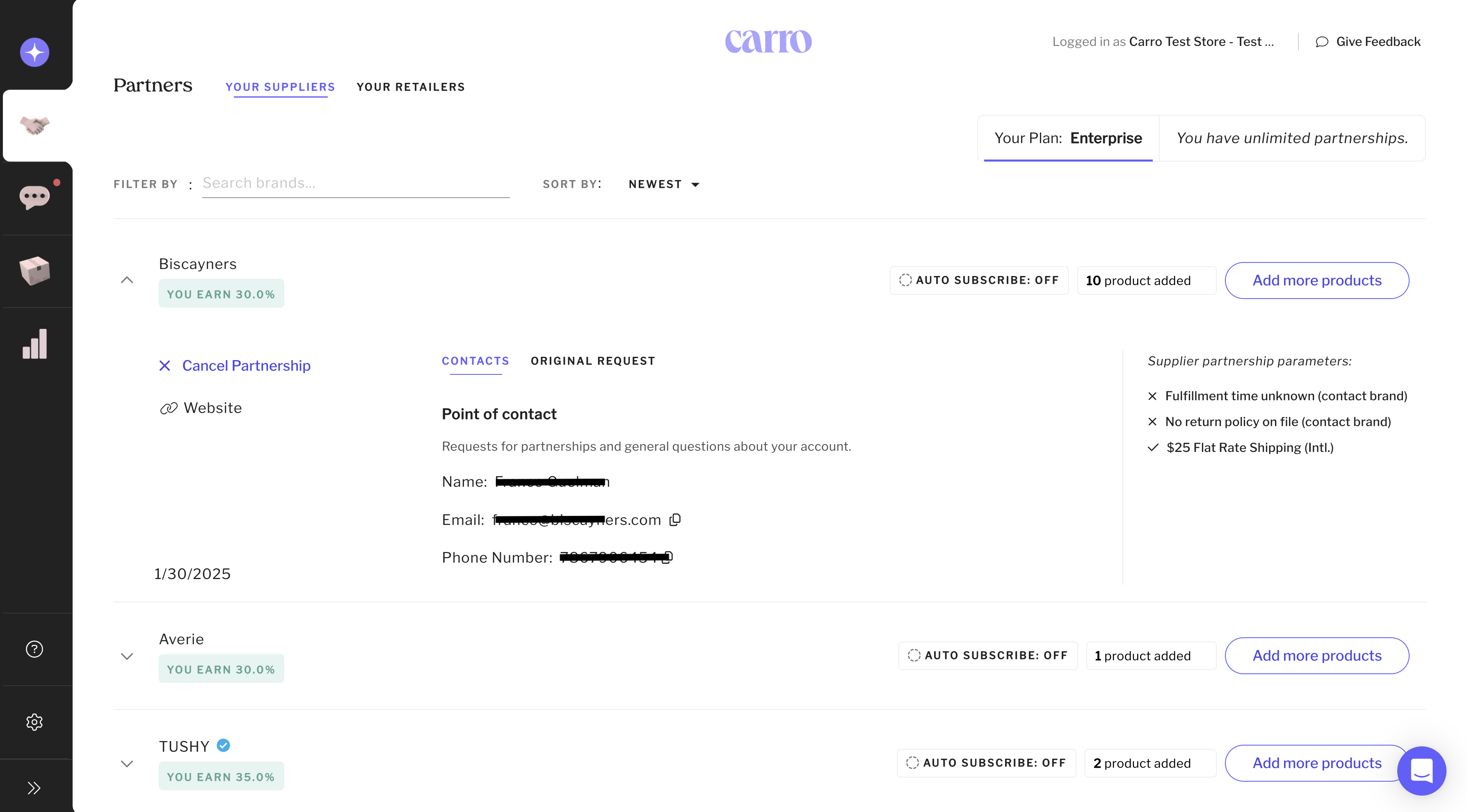 The Partners tab is where all of your active partnerships live. It gives you quick access to partner details, agreement terms, and product management tools.