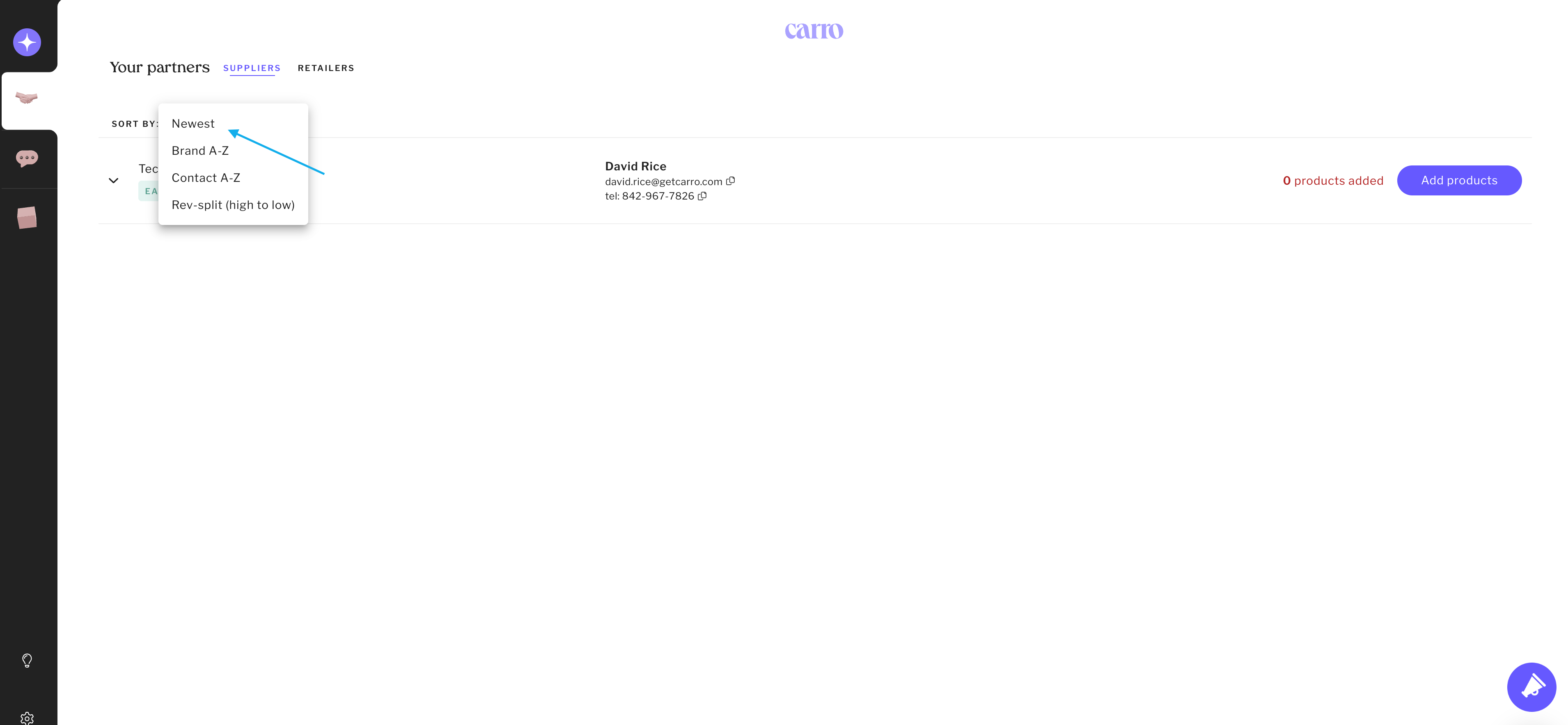 Sort partnerships by newest, alphabetical, brand/contact, or rev-split (high to low).