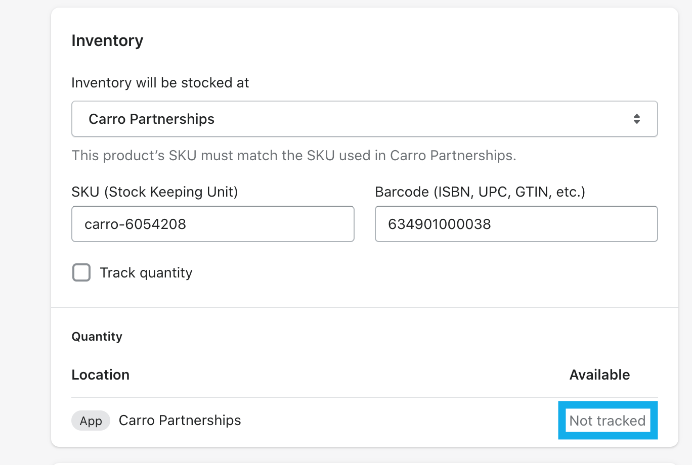 Unchecked → Carro interprets this as an unlimited supply. The retailer’s Shopify will show the product as “Not tracked,” and customers will be able to purchase the item regardless of available stock.