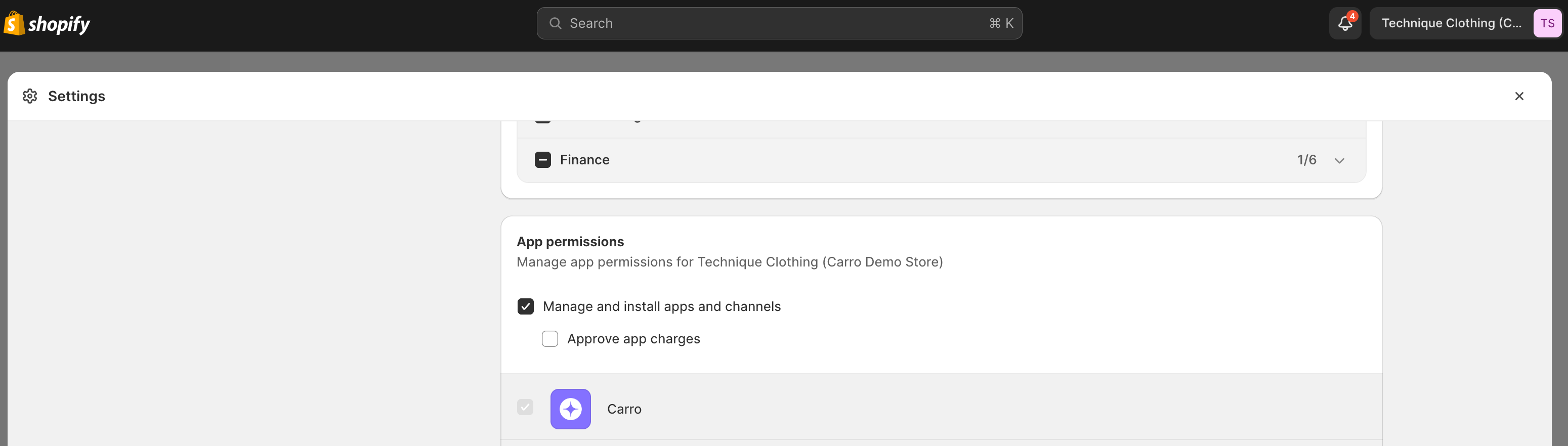 To give an employee access to your Carro Dashboard, you’ll need to set up a Shopify staff account with permission to access Apps > Carro.