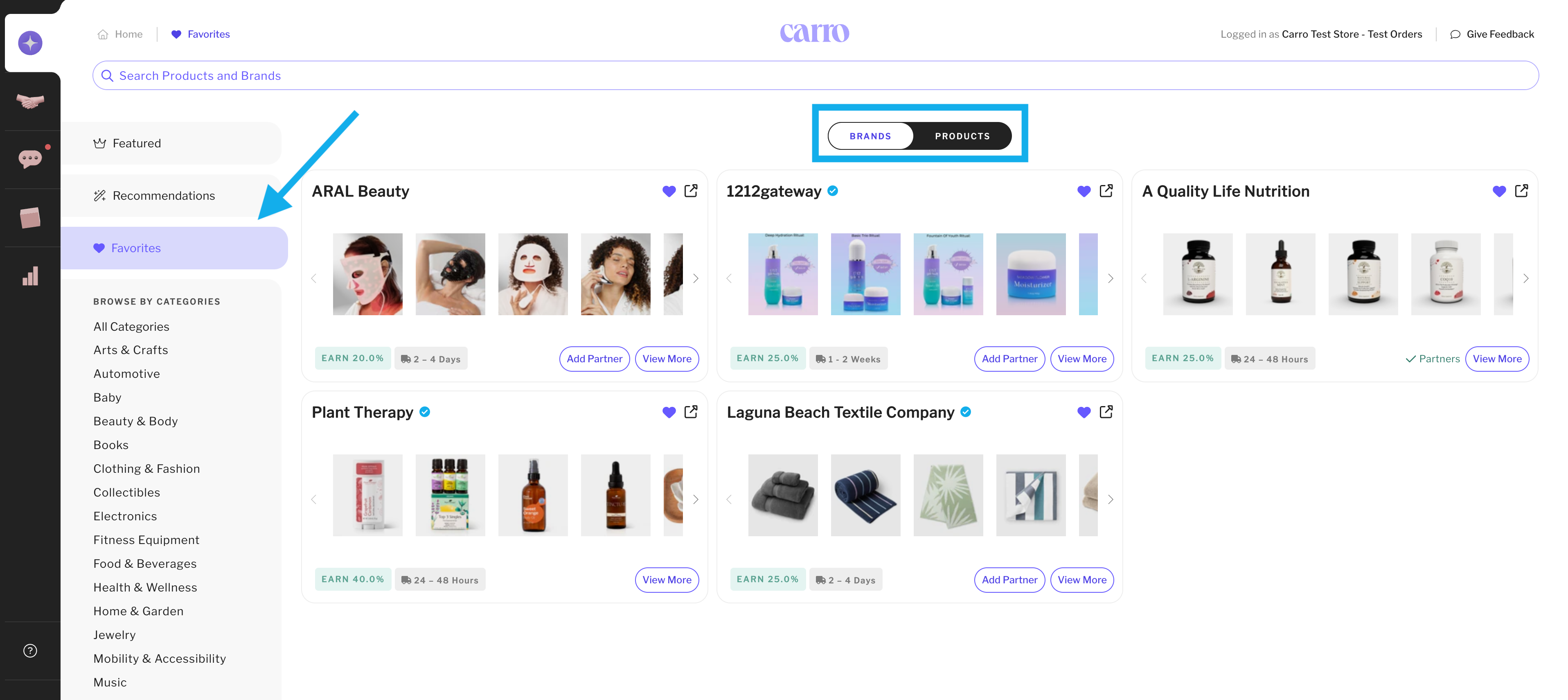 The Favorites feature allows retailers to bookmark supplier stores and products to add to their store later.