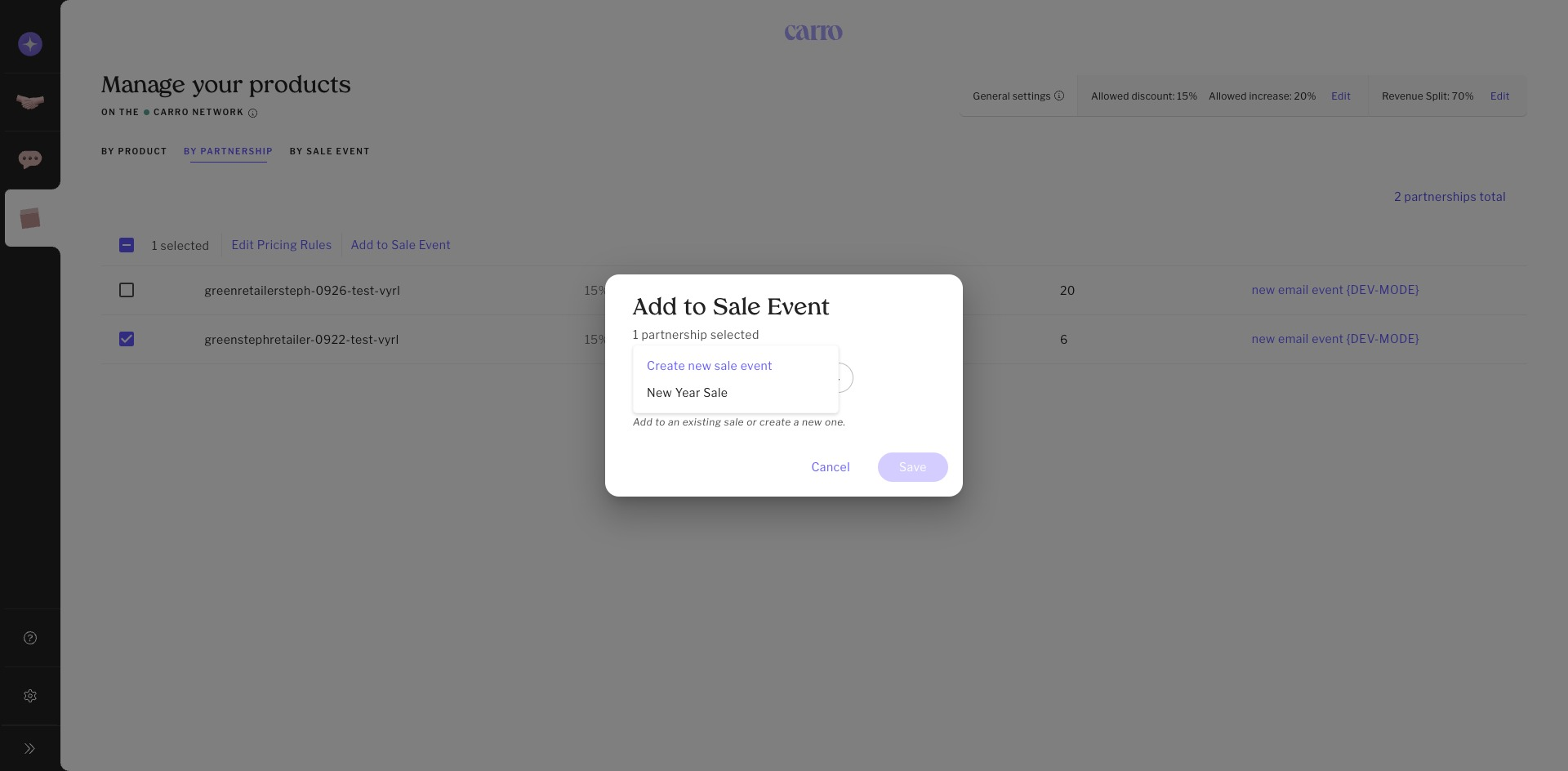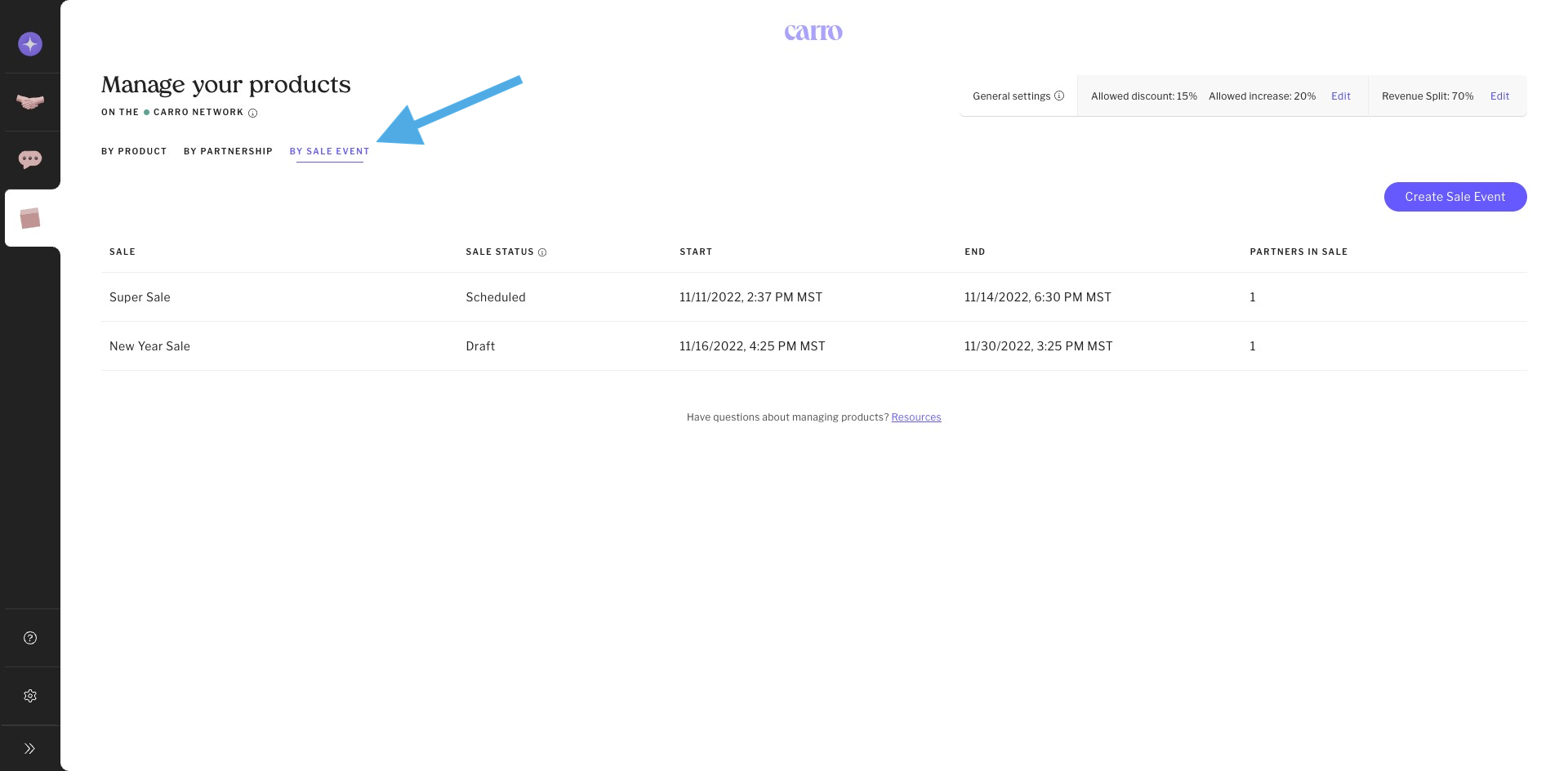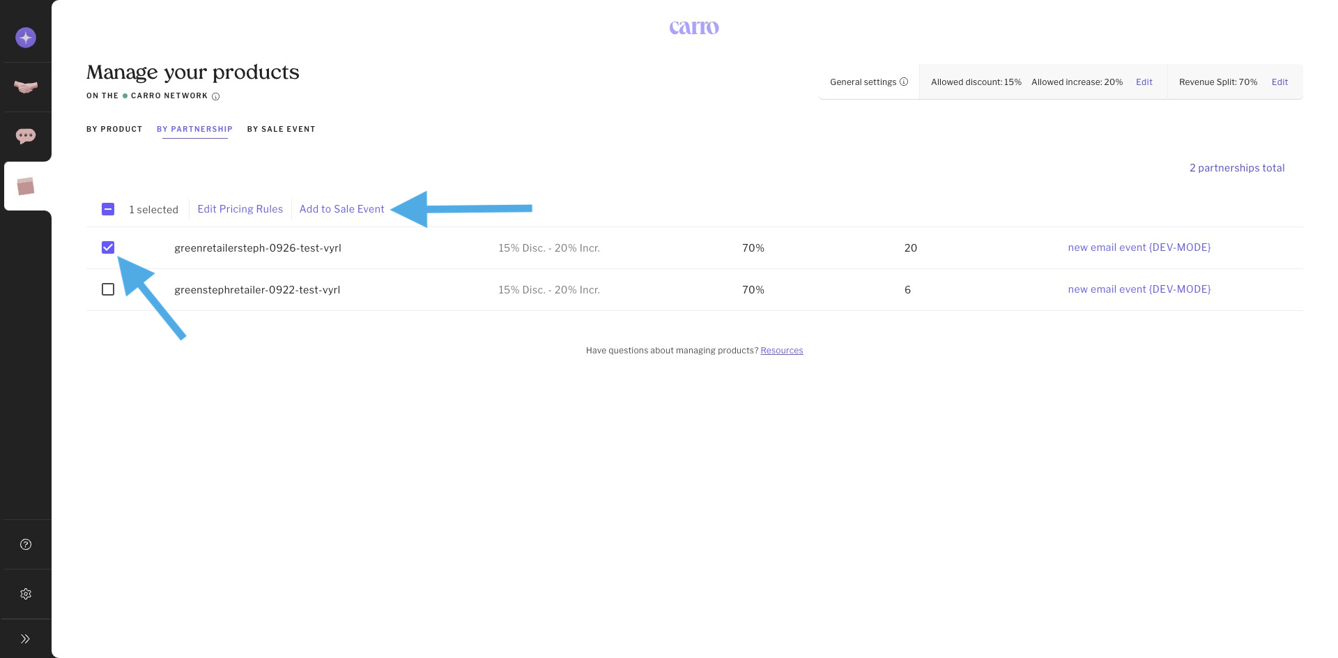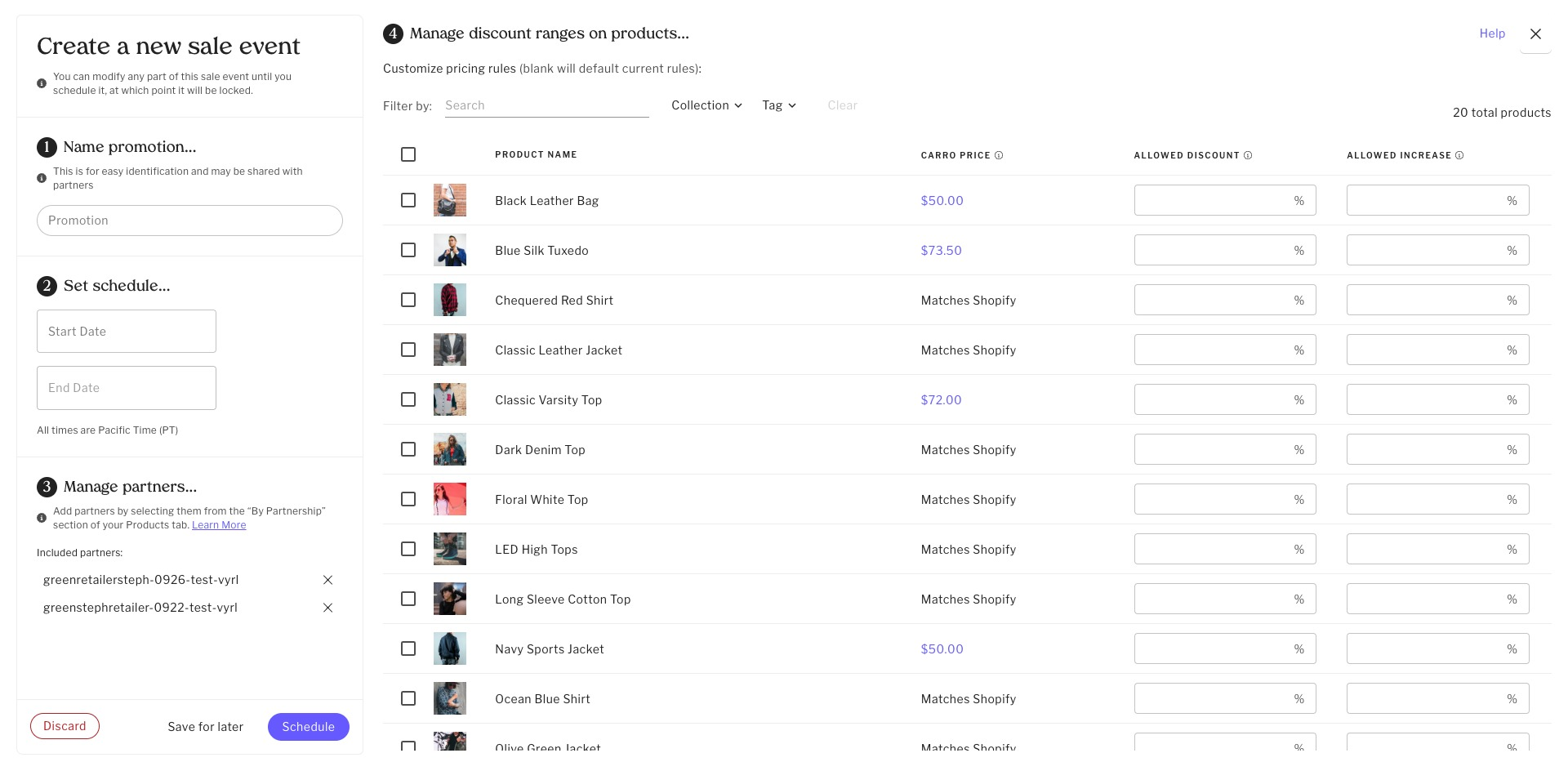 With Carro’s Sale Event tool, suppliers can create scheduled discount periods for selected partnerships. This makes it easy to run special promotions with your retailers while maintaining control over pricing and timing.