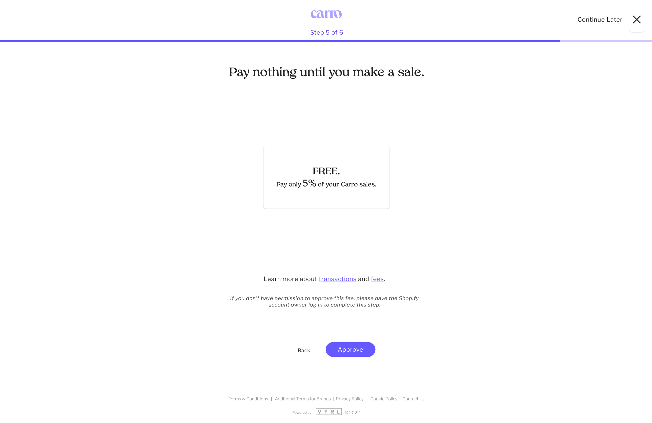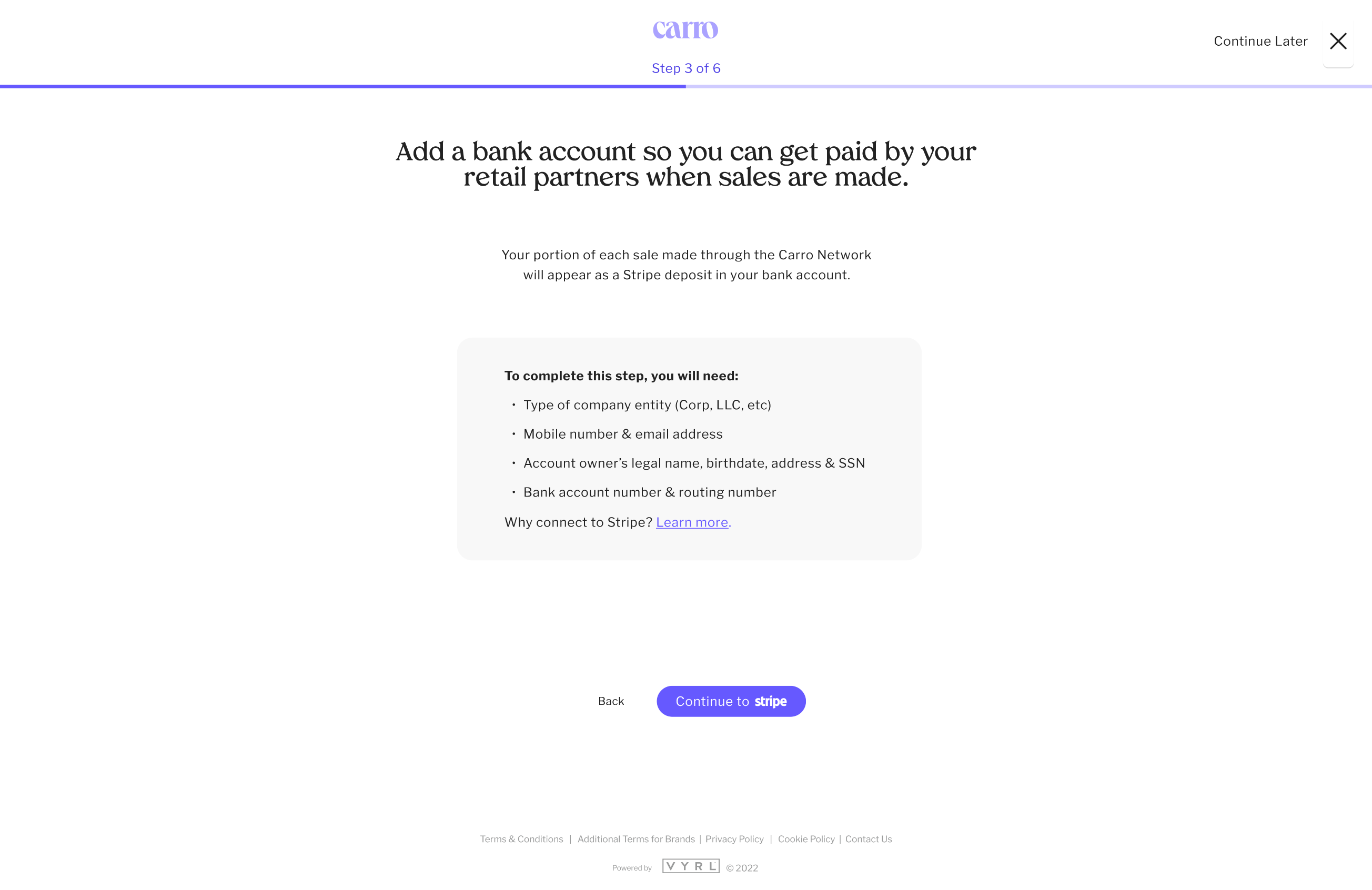 5. Connect an existing or create a new Stripe account so you can get paid out instantly for Carro orders.