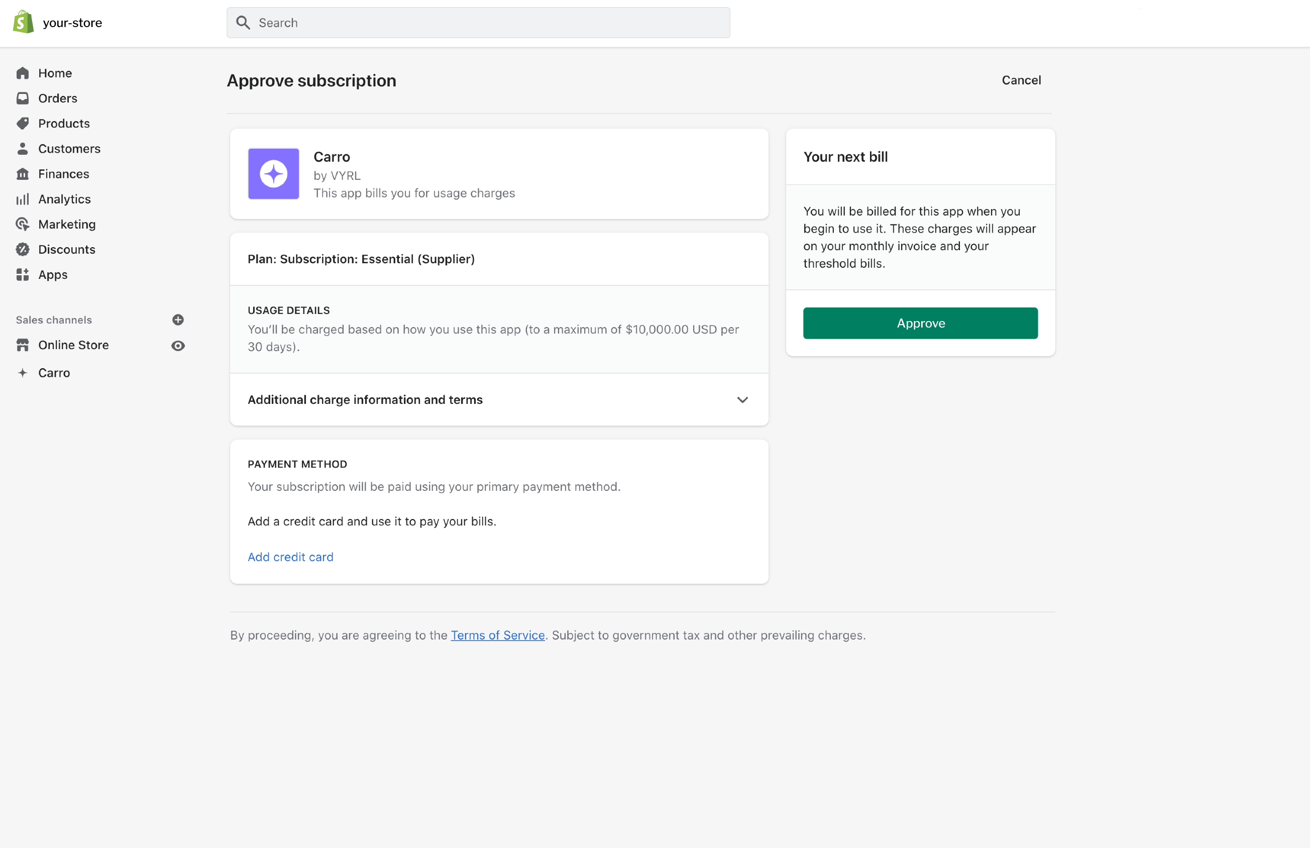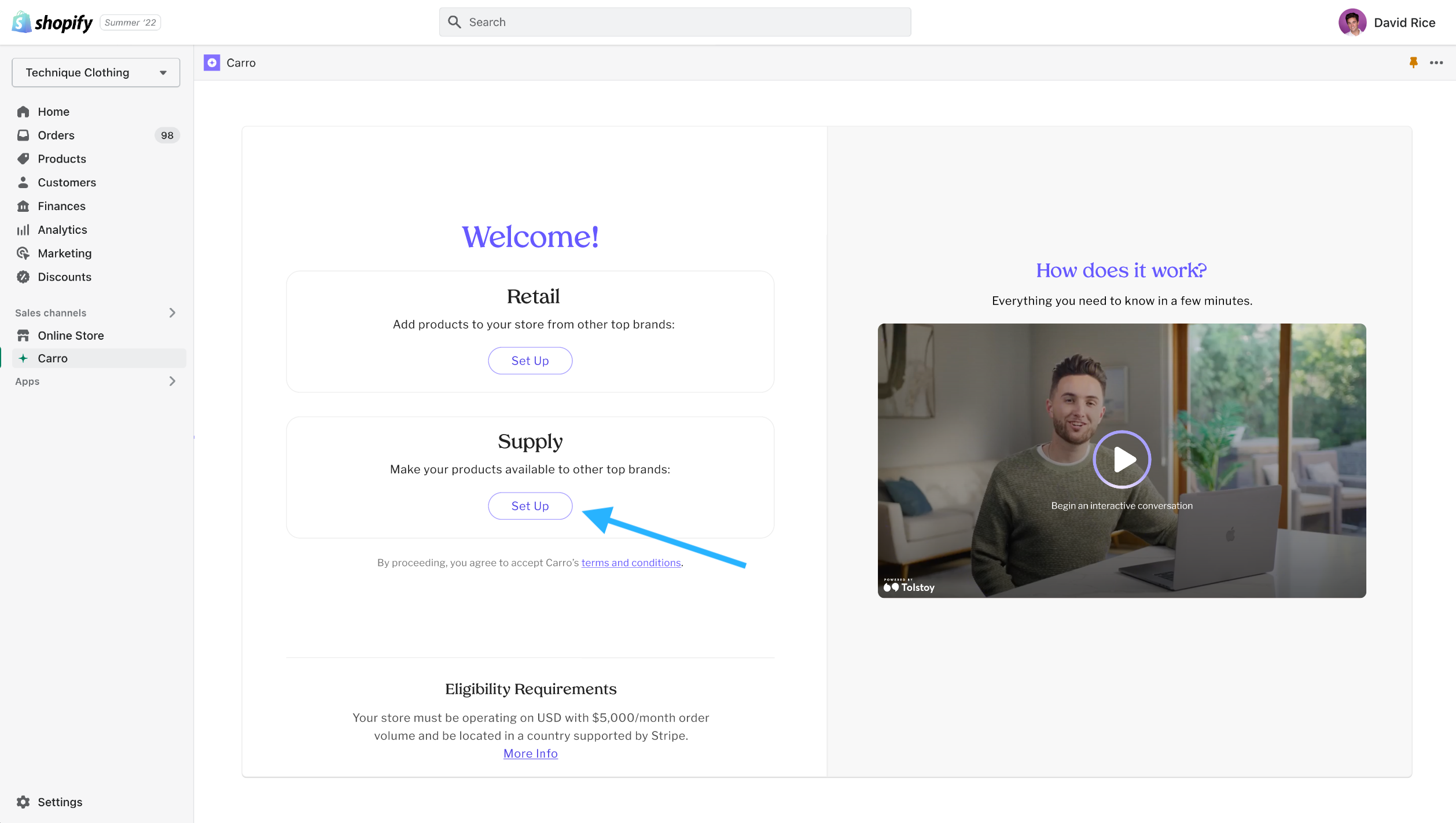 1. Head over to Carro in your Sales Channel section of Shopify.