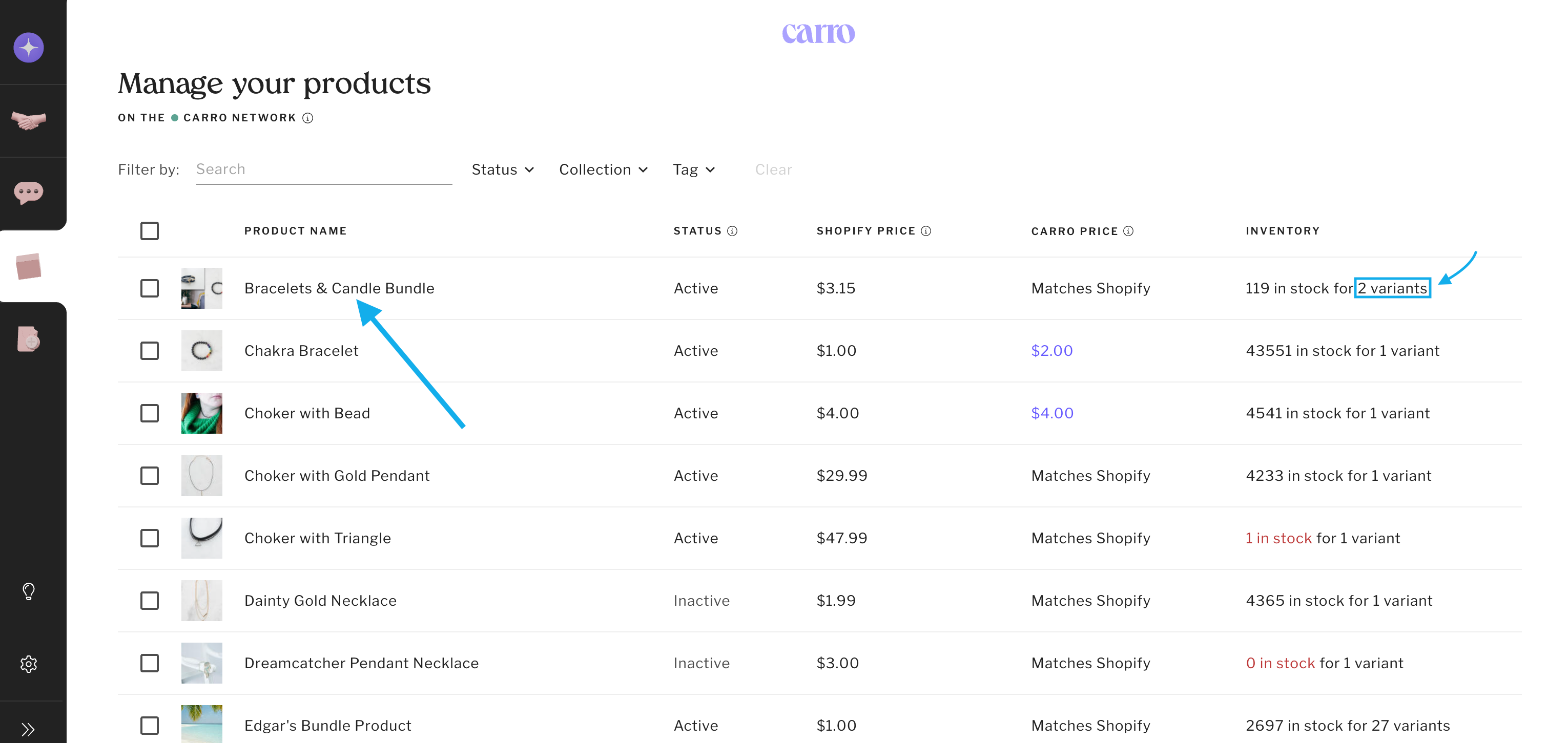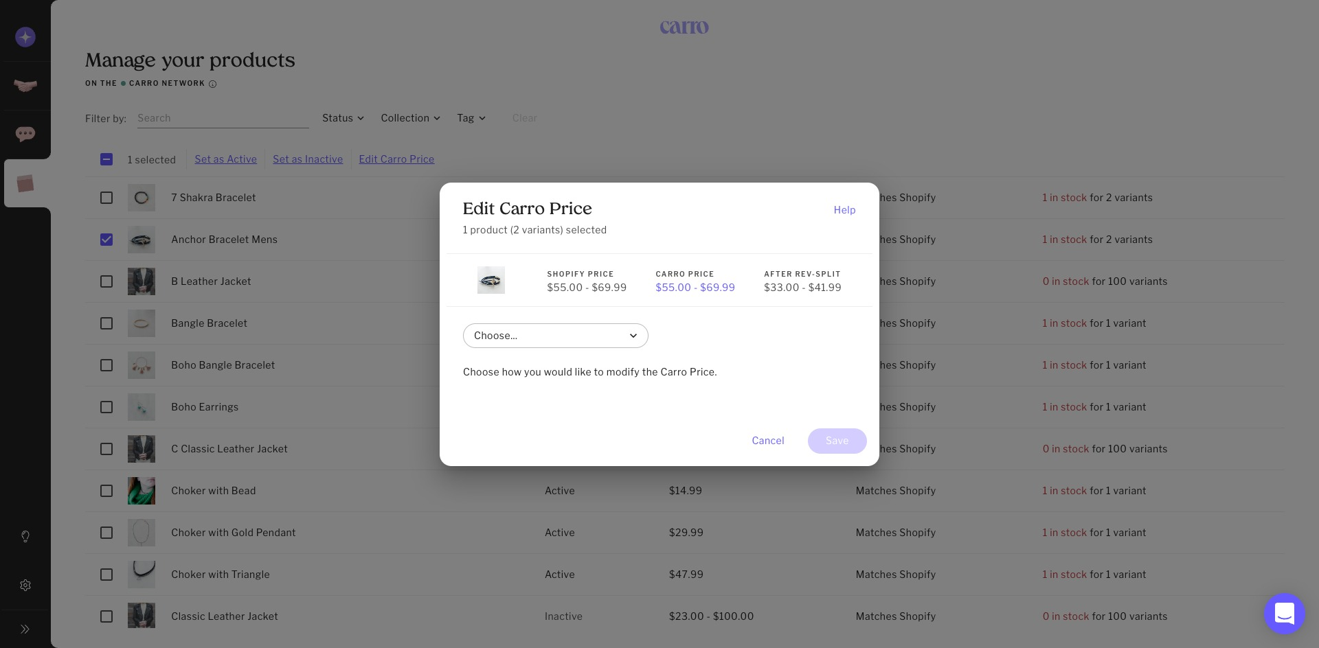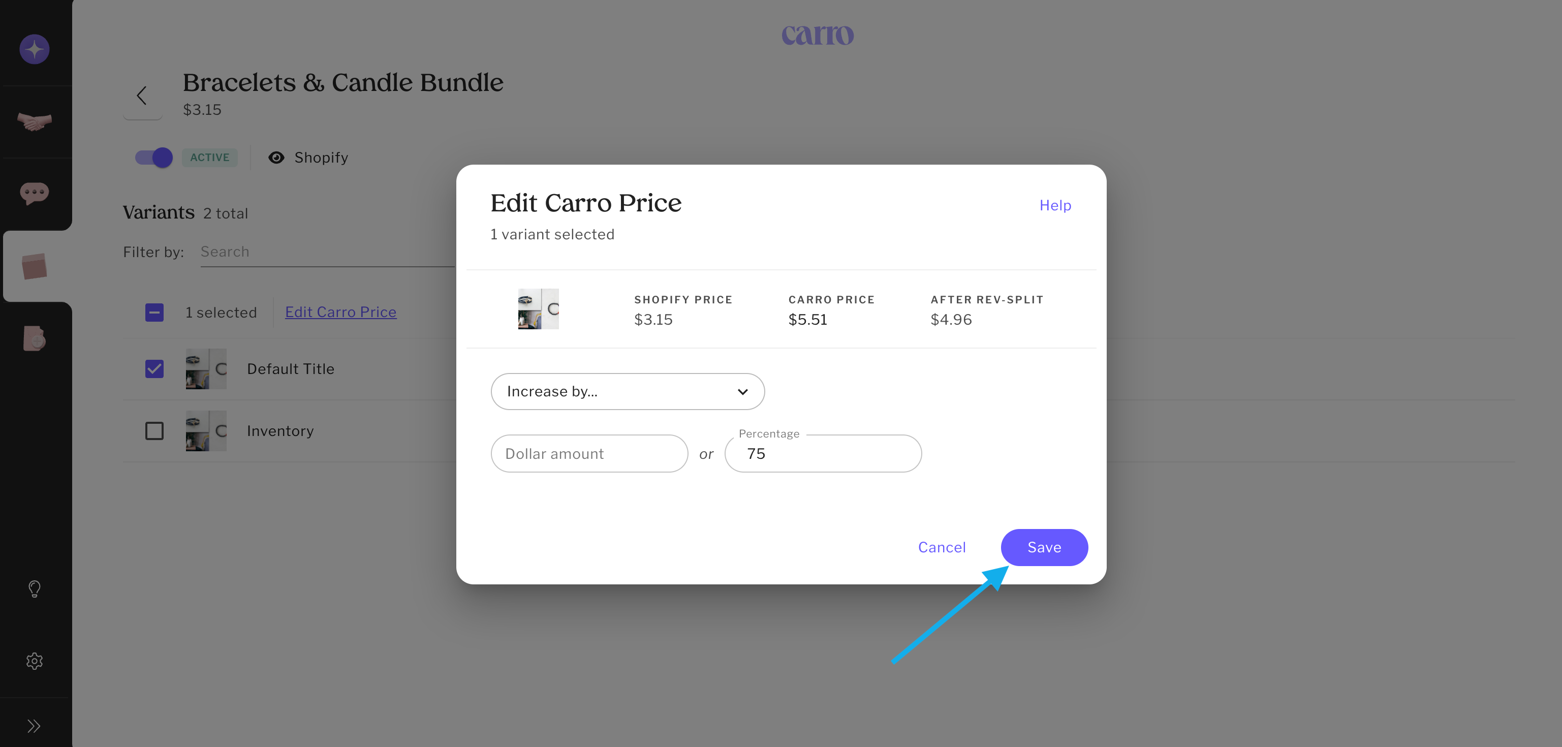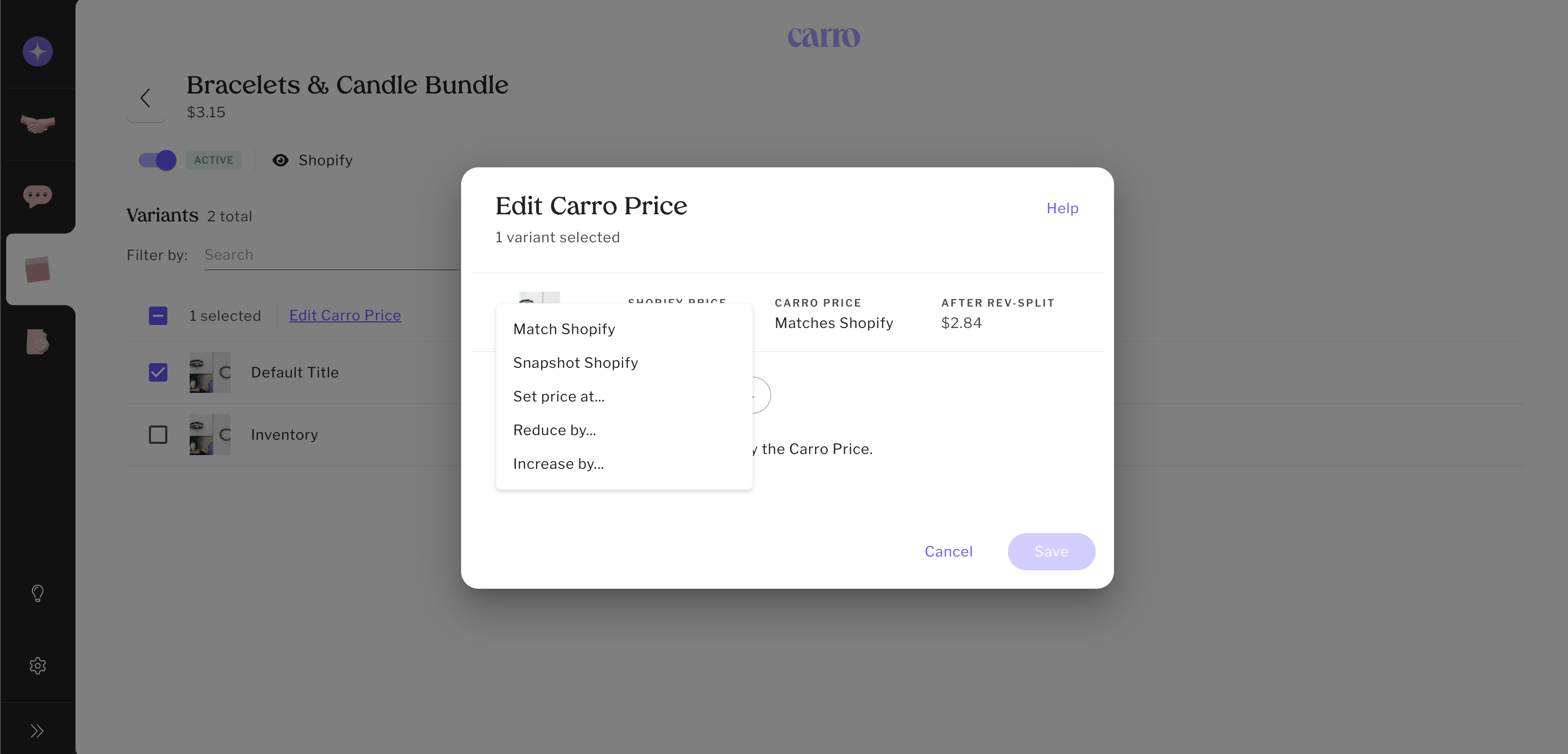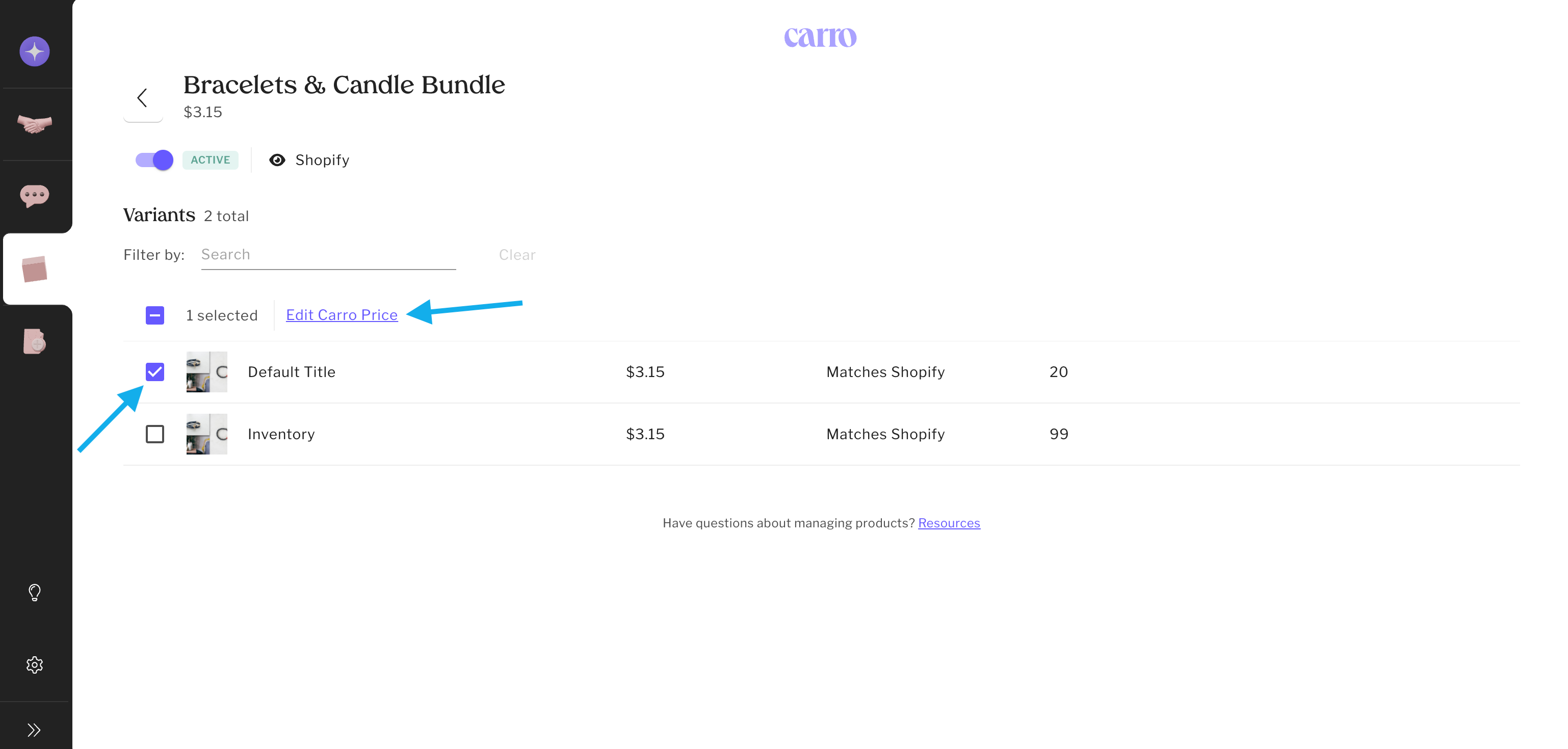 Select one variant (or in bulk), then click Edit Carro Price.