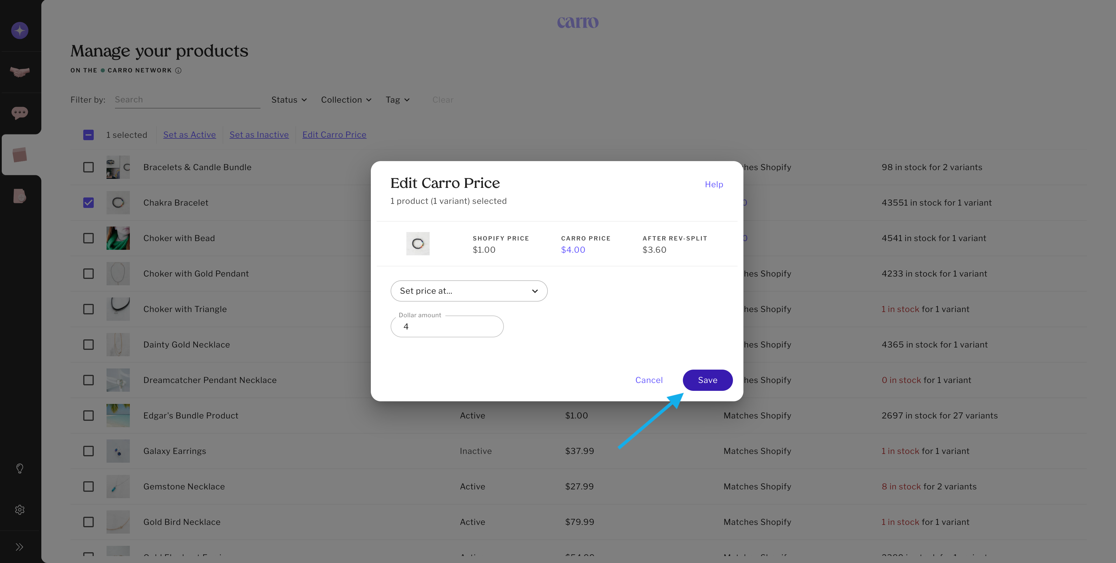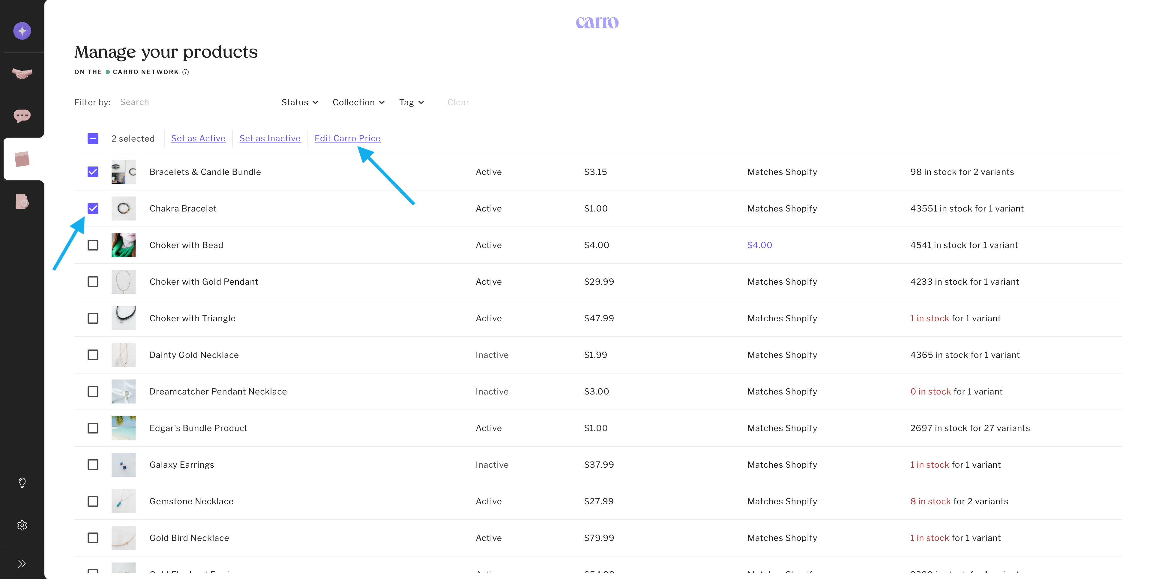 Select one product (or in bulk), then click Edit Carro Price.