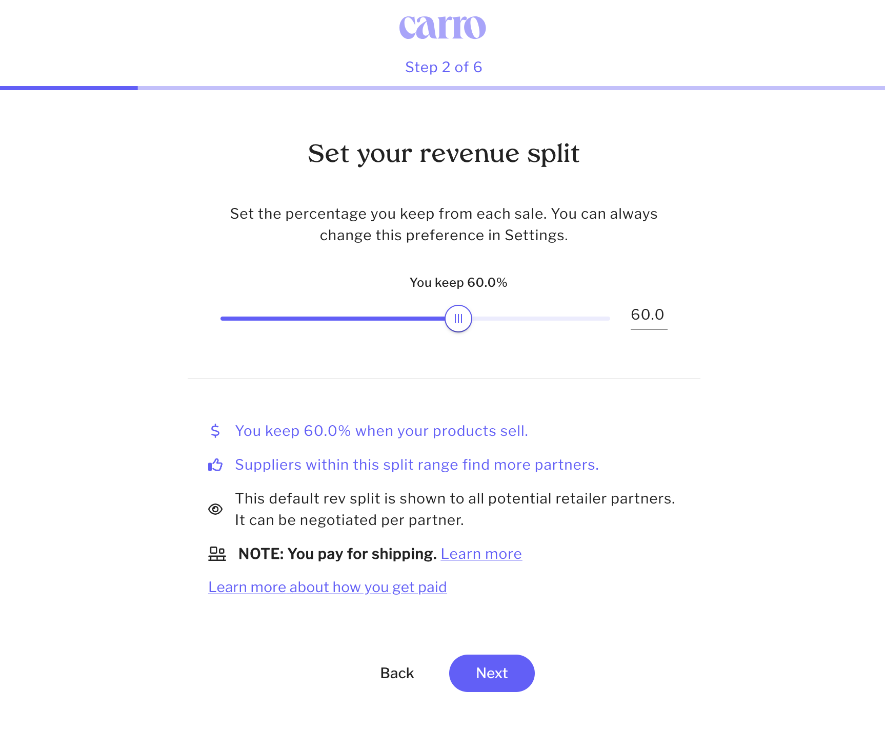 Once set, retailers can view your revenue split in your Carro Directory listing before deciding to partner with you.