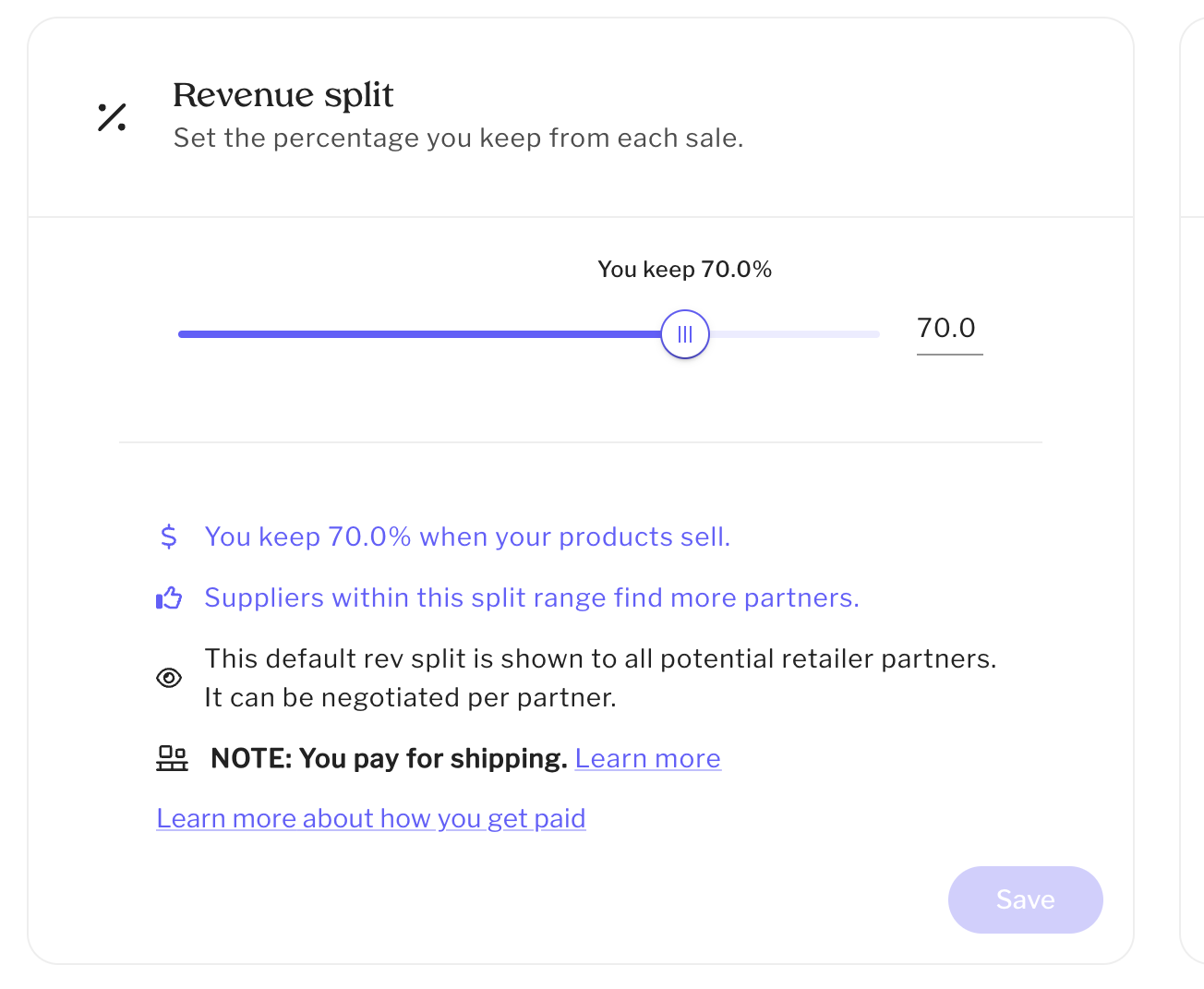 As a supplier, you decide the percentage you keep from each sale. This Revenue Split determines how profits are shared between you and your retail partners.