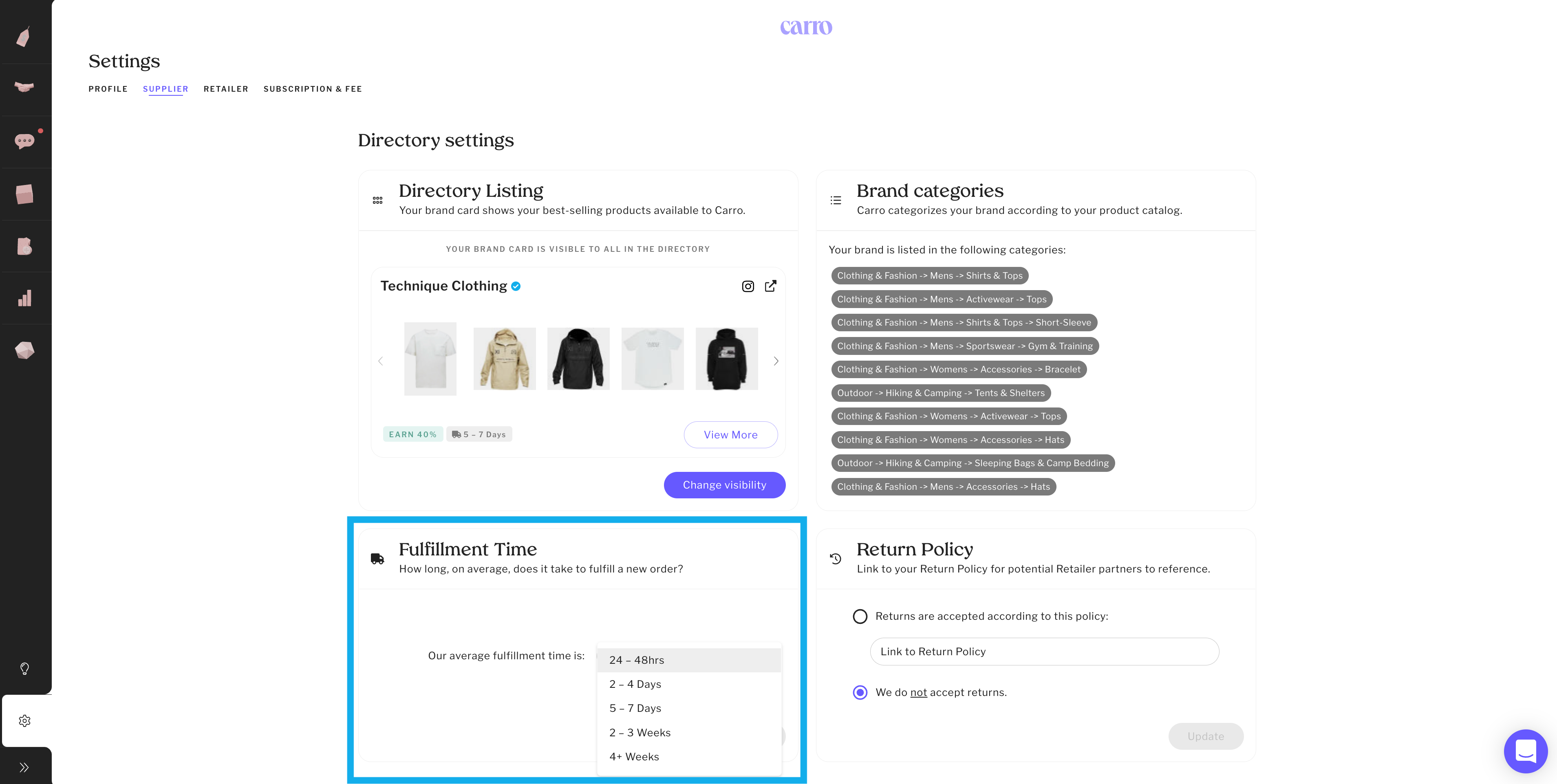 In Carro, Fulfillment Time is defined as the amount of time it takes for a supplier to receive an order and ship it.
