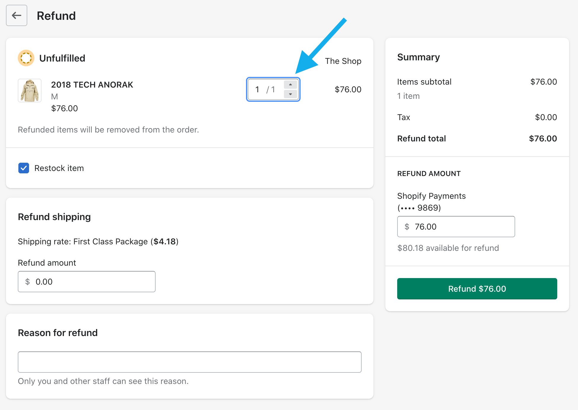 Refunds the customer for the product cost (shipping is excluded unless the retailer chooses to refund it).