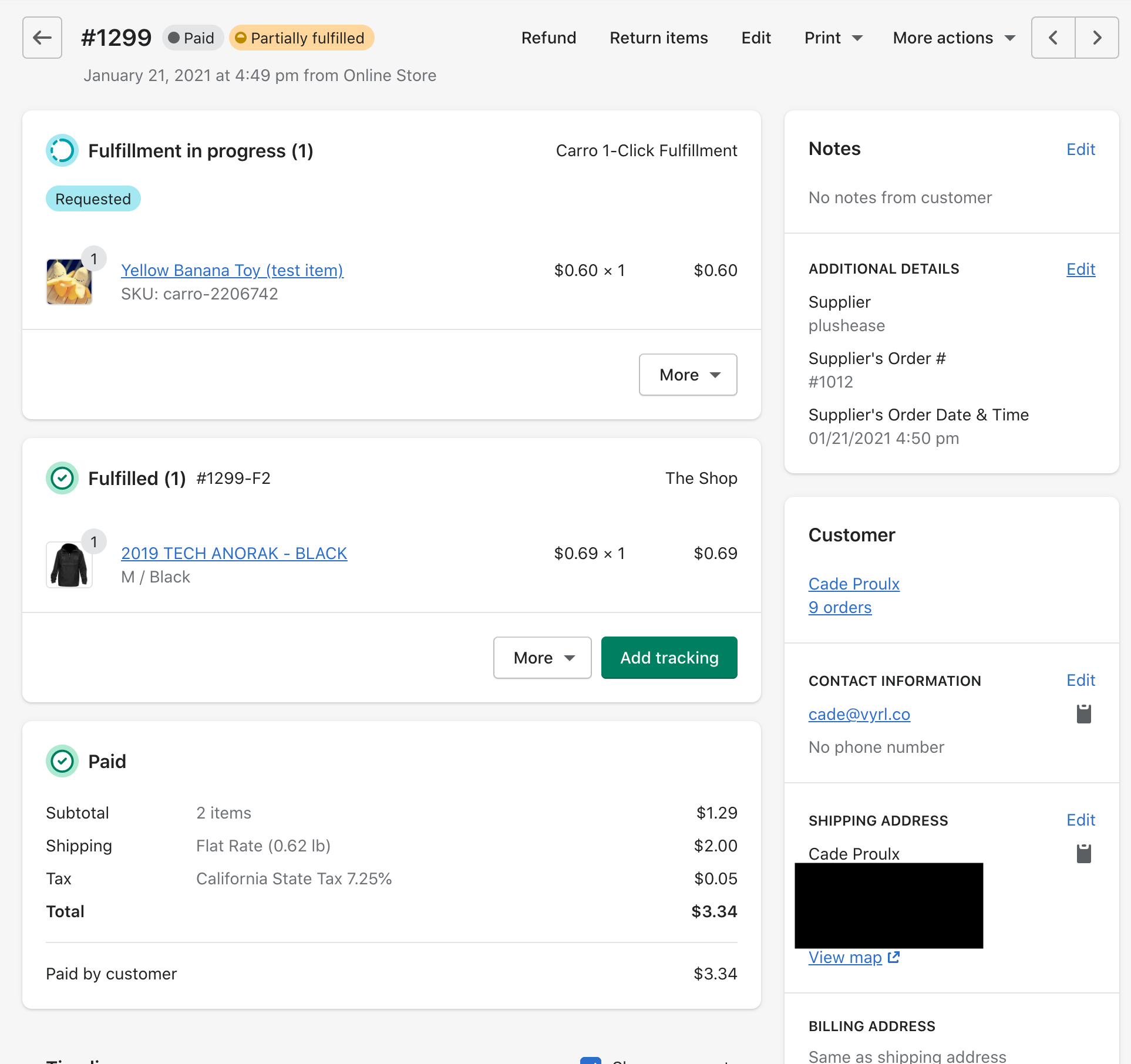Customers receive separate emails with separate tracking numbers once each party fulfills their portion.