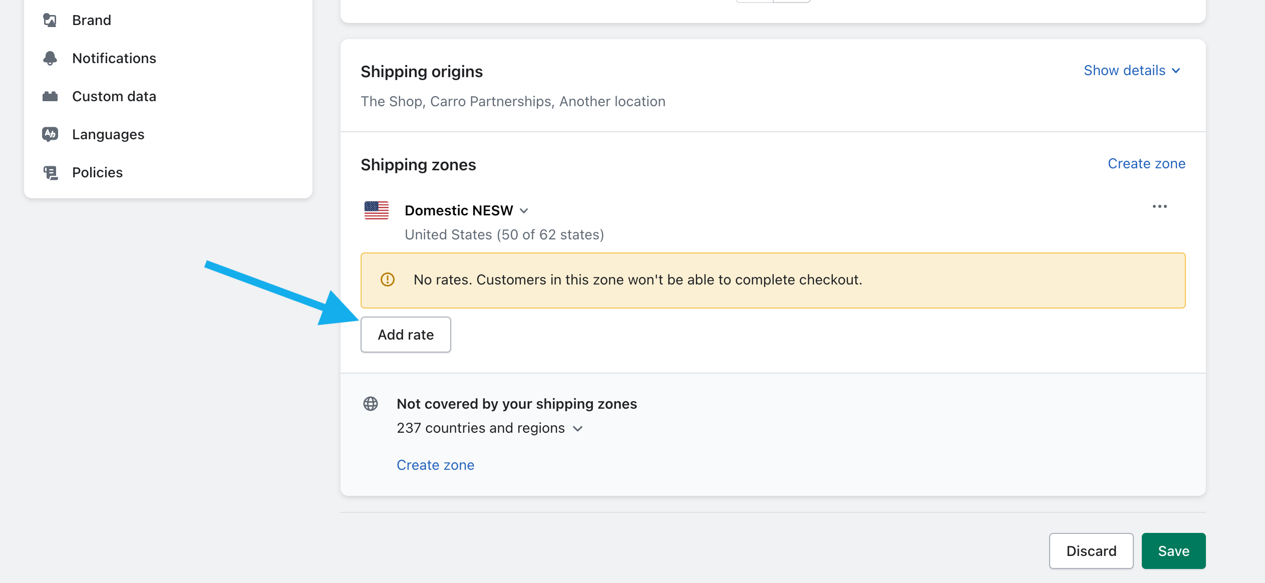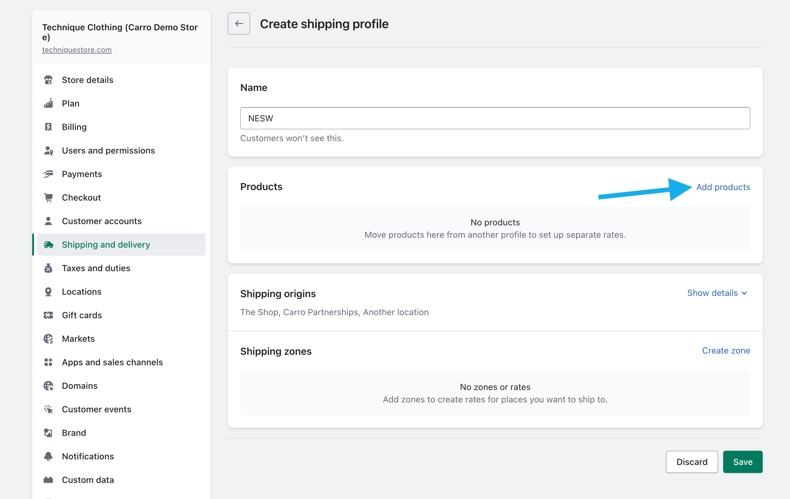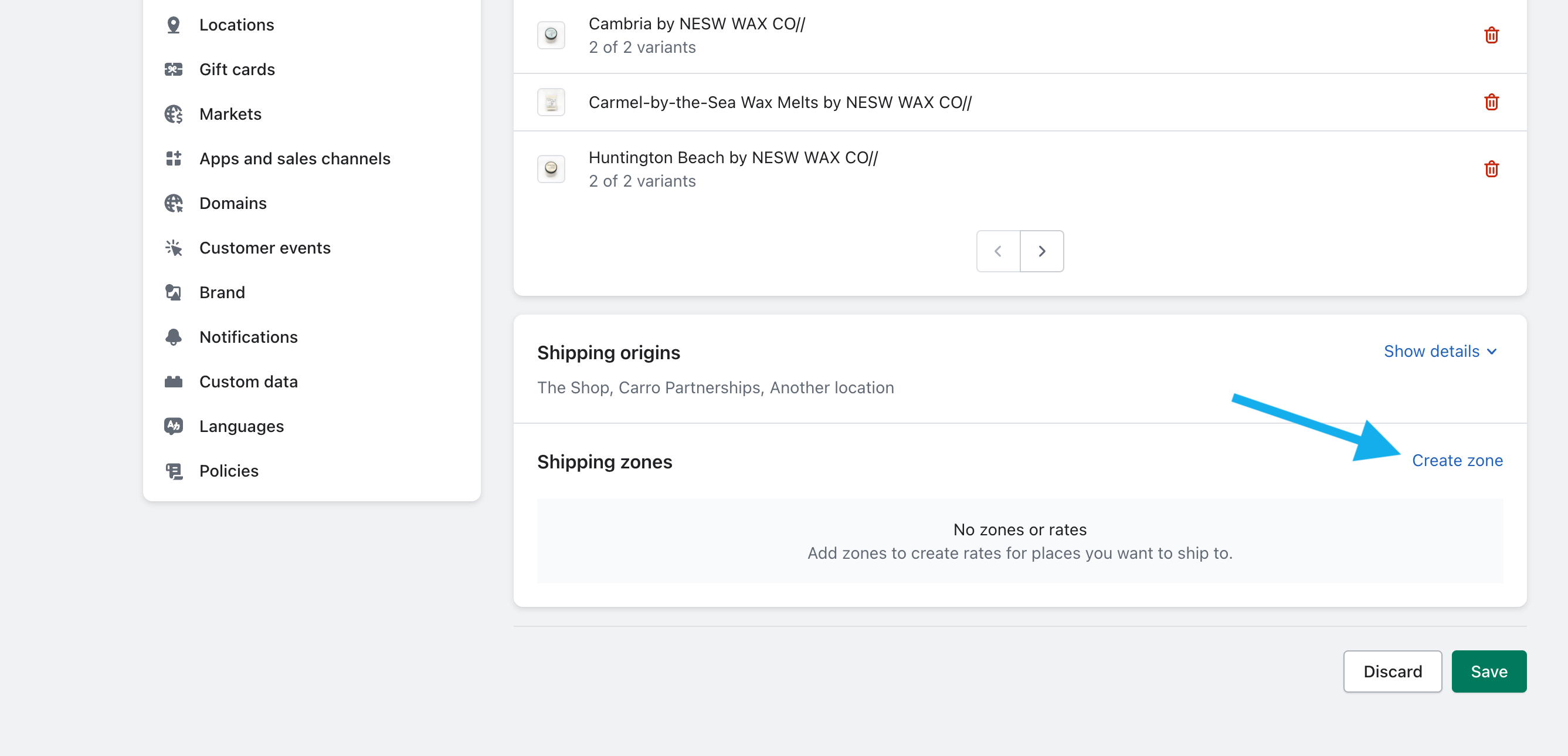 Scroll to the Shipping origins section and click Create zone.
