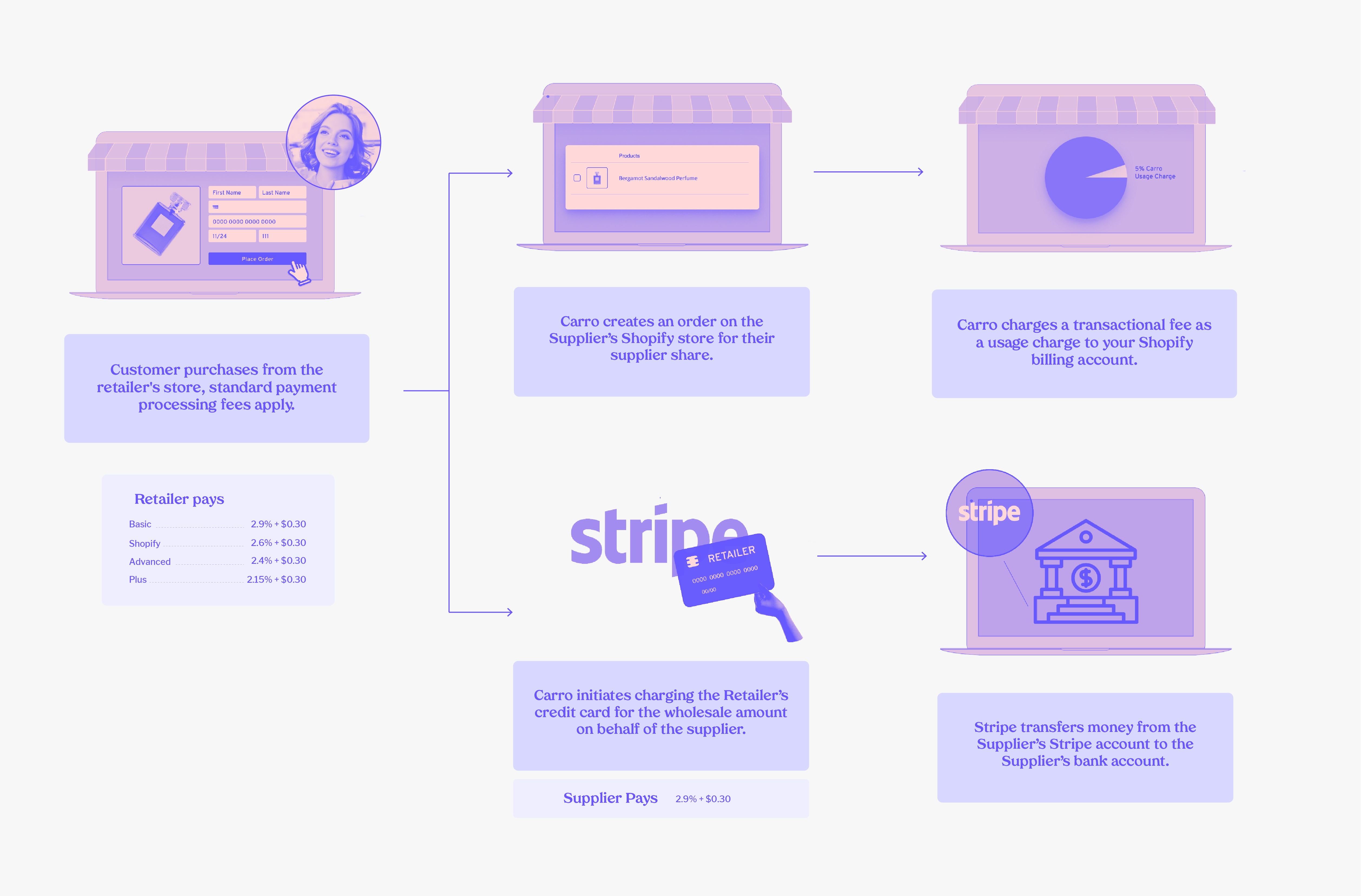 Depending on the retailer’s Carro subscription plan, Carro takes 10%, 7%, or 5% of every order on the retailer’s side in the form of a Shopify usage charge. Suppliers are paid the same amount, no matter what plan the retailer is on.