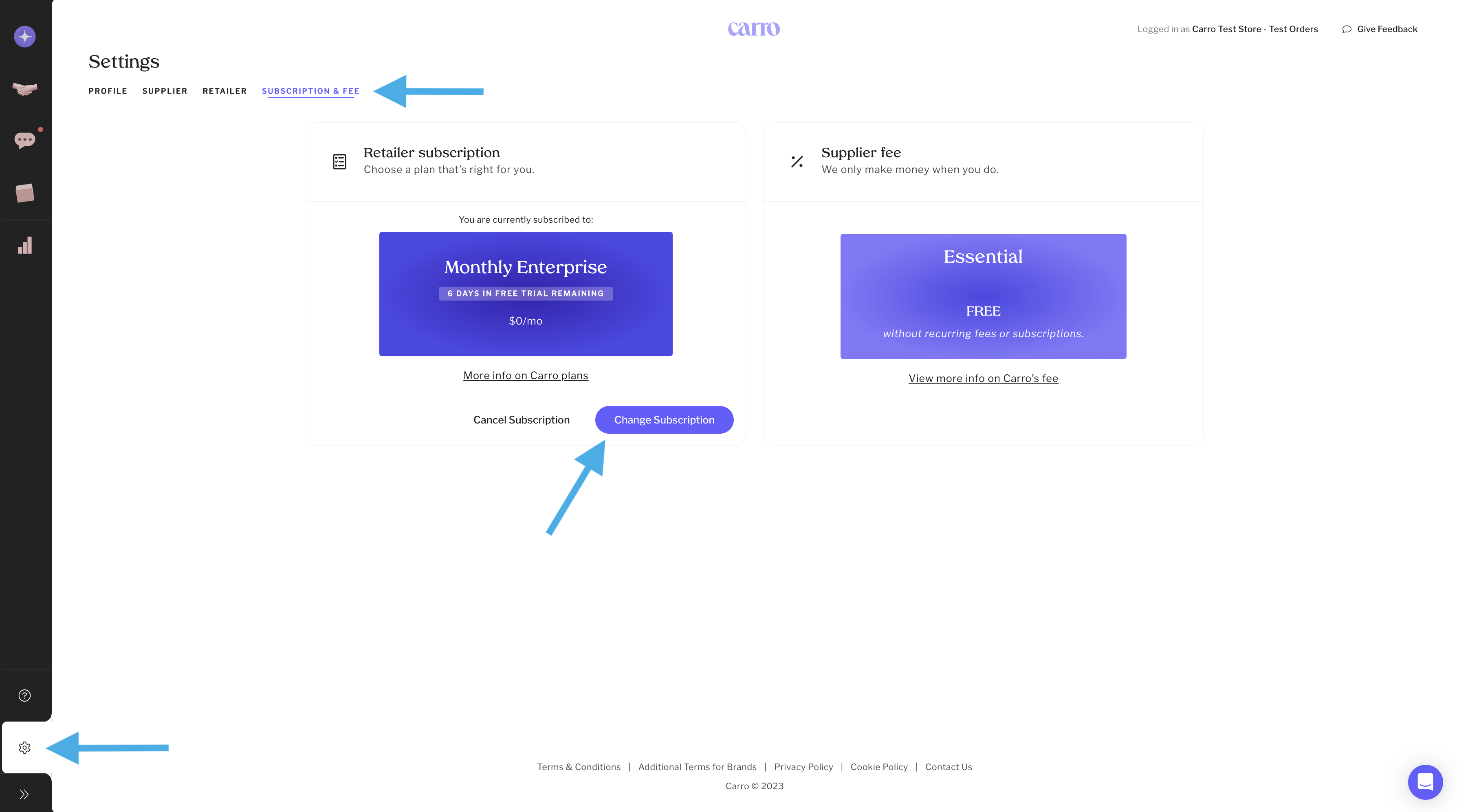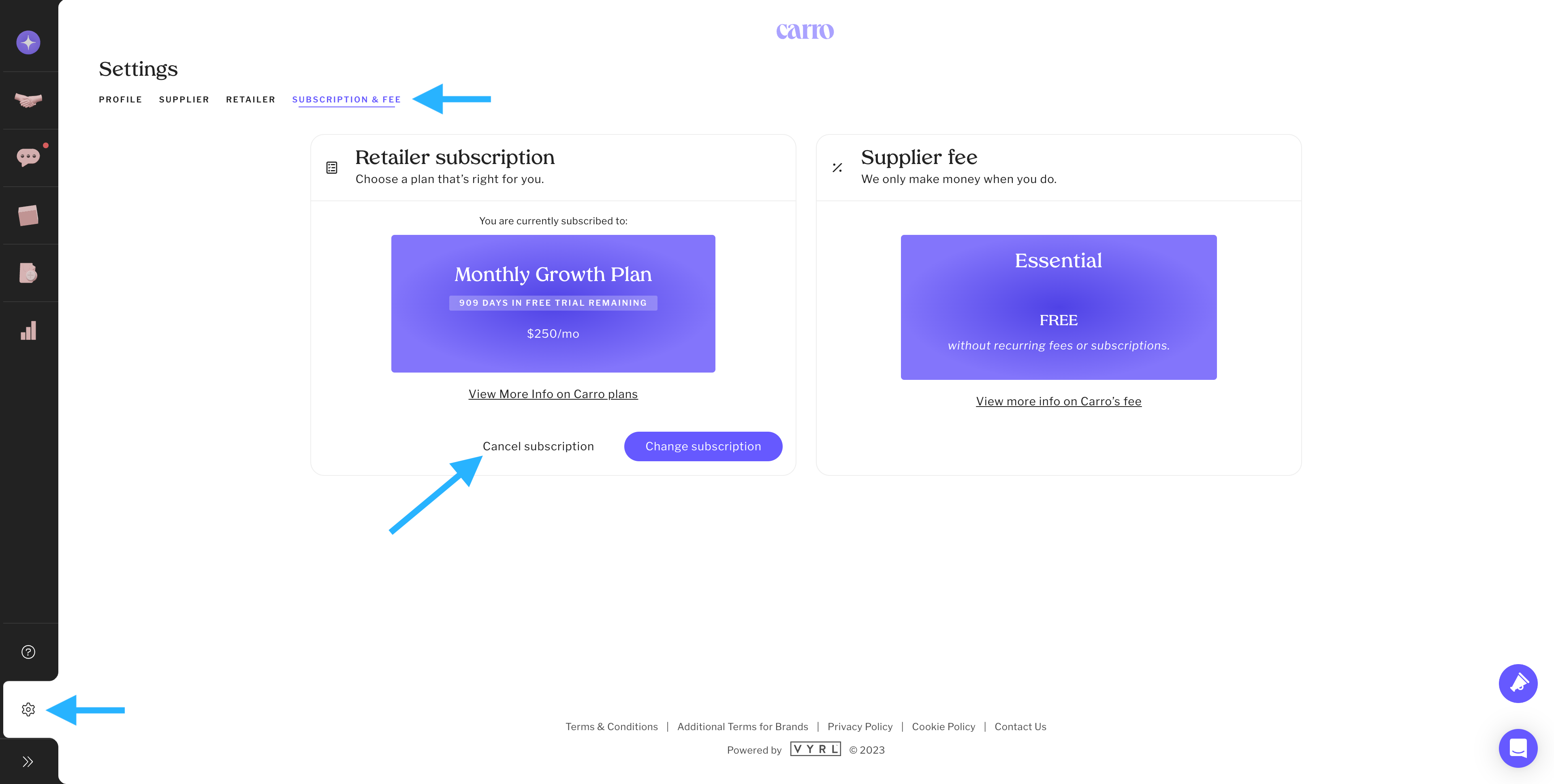 There is only one Supplier plan (free) and it cannot be canceled while using Carro.